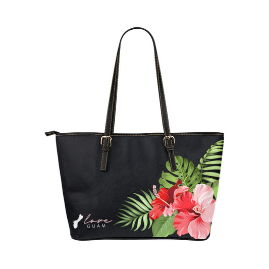 Love Guam Hibiscus Black Large Leather Tote Purse