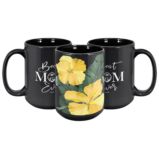 Best Mom Ever Script Guam Hibiscus Paradise Yellow 15oz Black Mug
