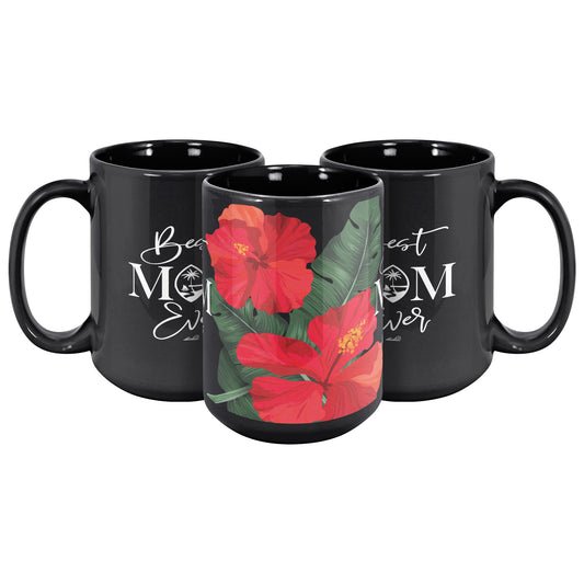 Best Mom Ever Script Guam Hibiscus Paradise Red 15oz Black Mug