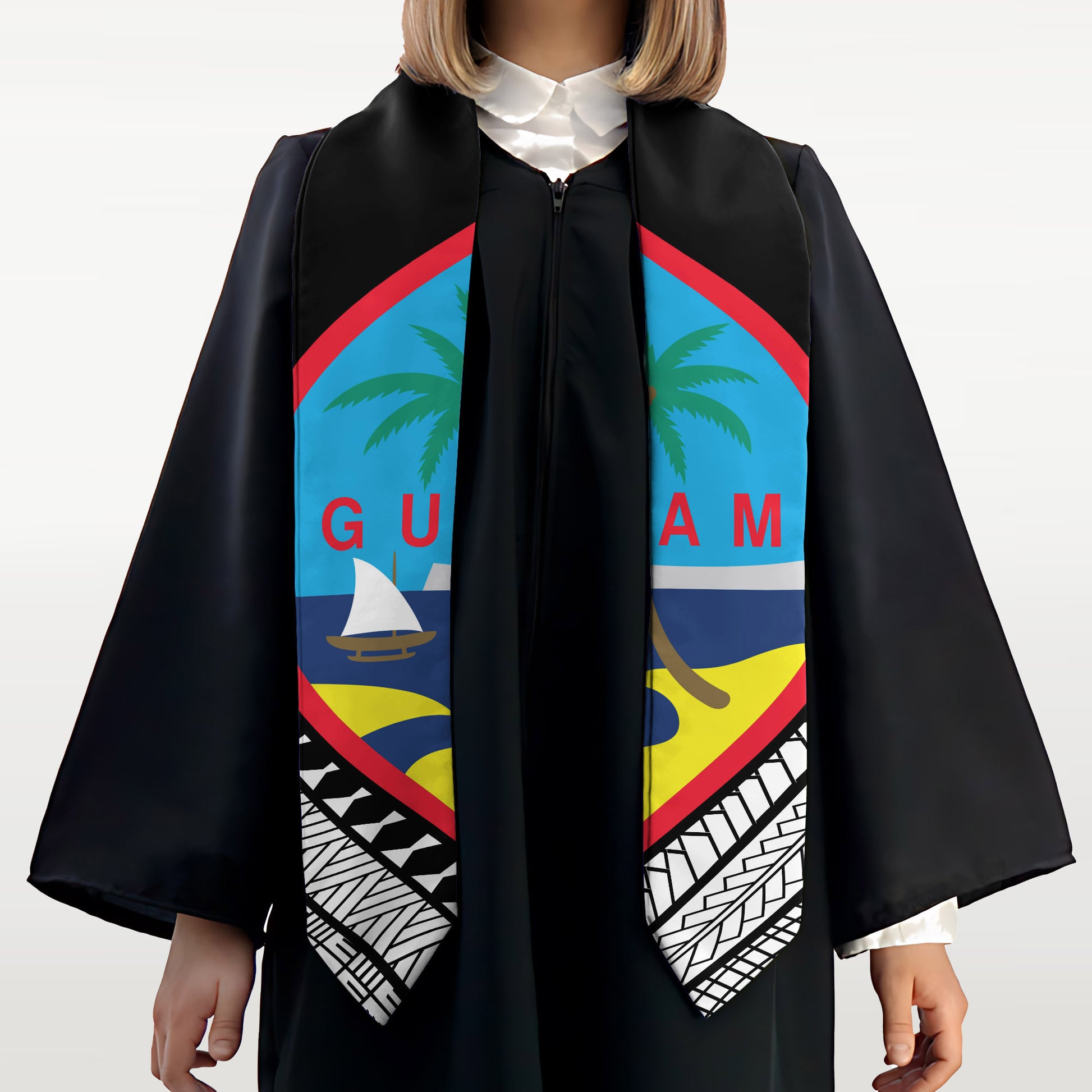 Experience the pride and legacy of Guam with our Guahan Half Tribal Black Graduation Stole. Celebrate your academic achievements and honor your cultural heritage in an elegant and exclusive way. This custom sash is a perfect addition to your graduation attire, telling your unique story of success.