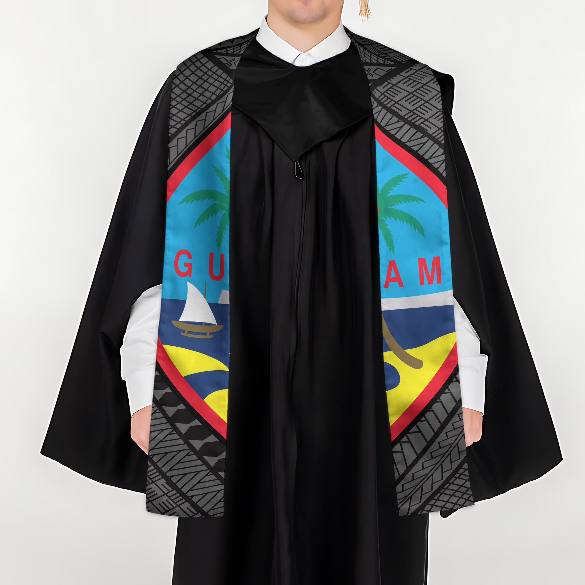 - Elevate your graduation ensemble with the Guam Graduation Stole, crafted in a luxurious 5x78" size. This length of 39 inches on each side adheres to the sizing specifications of most prestigious academic institutions.