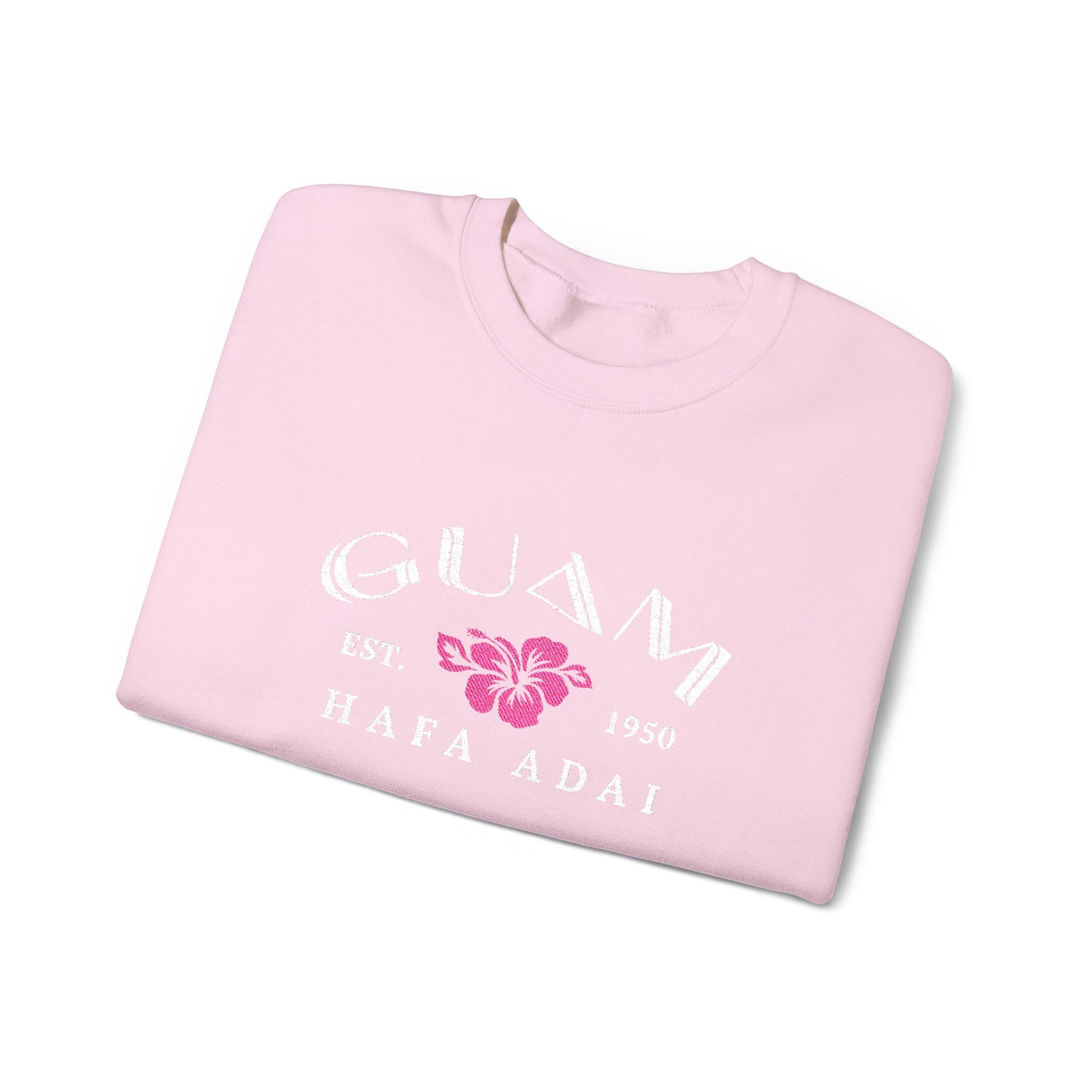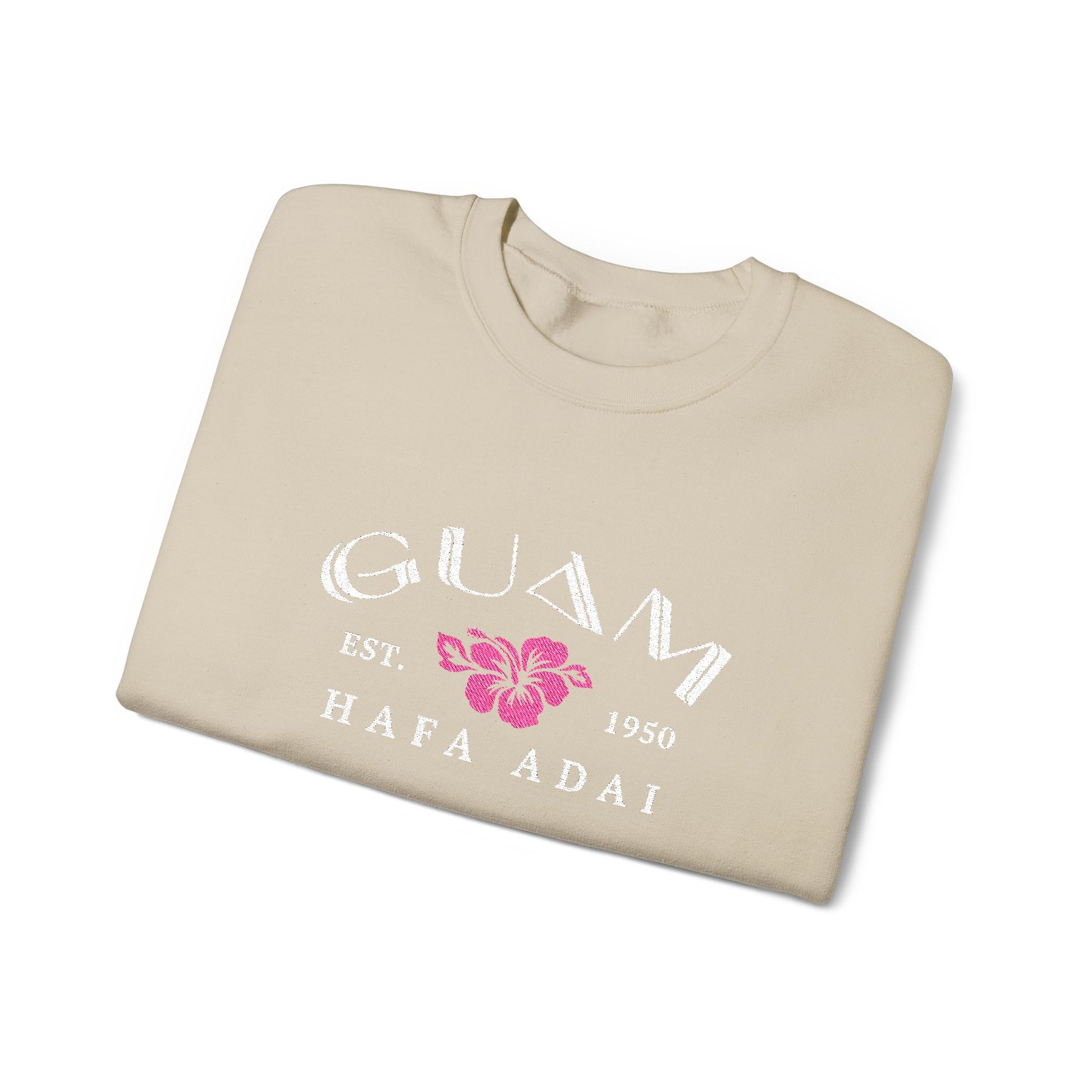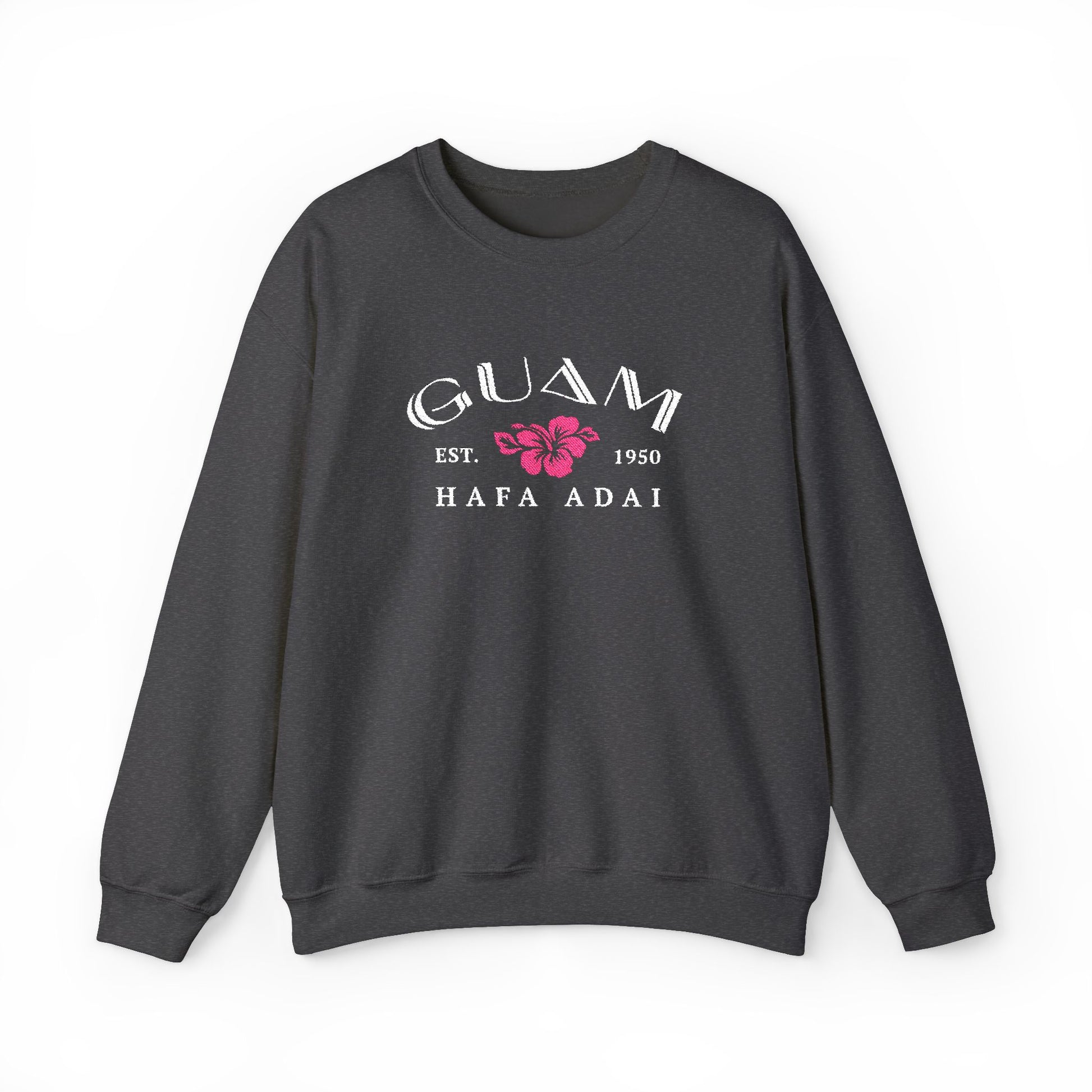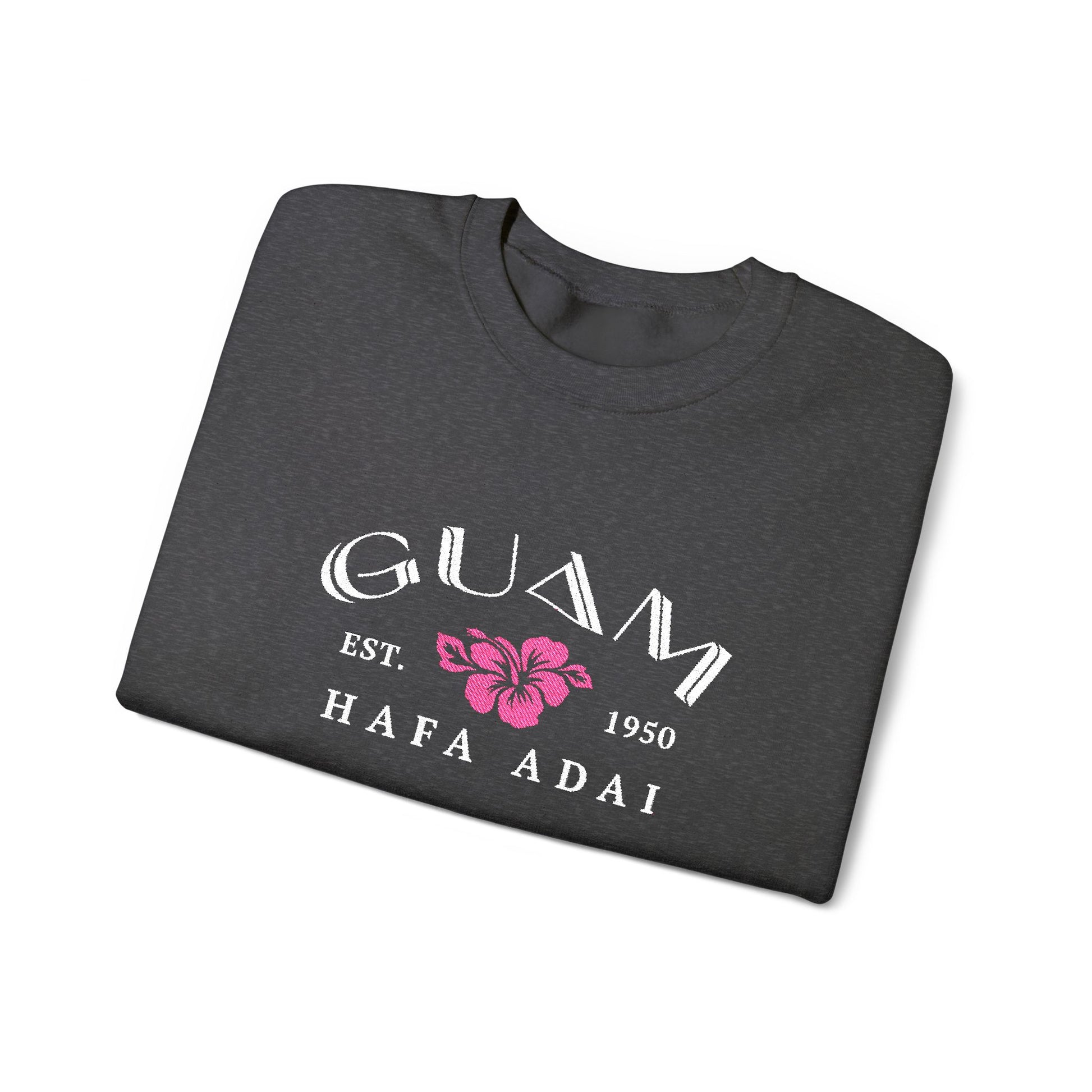 Boost your island style with the Guam Hibiscus Hafa Adai Embroidered Sweatshirt, featuring “Guam” arched above a bold hibiscus flower, “Est. 1950,” and the iconic island greeting Hafa Adai. Designed for comfort, durability, and crisp embroidery, this sweatshirt blends cultural pride with everyday wearability.