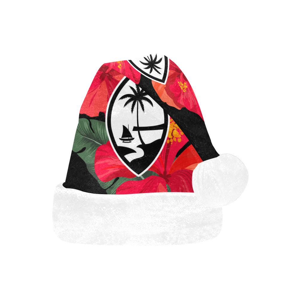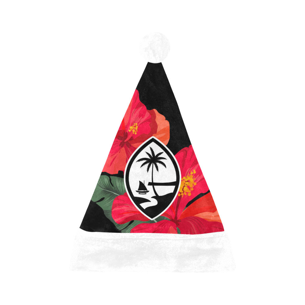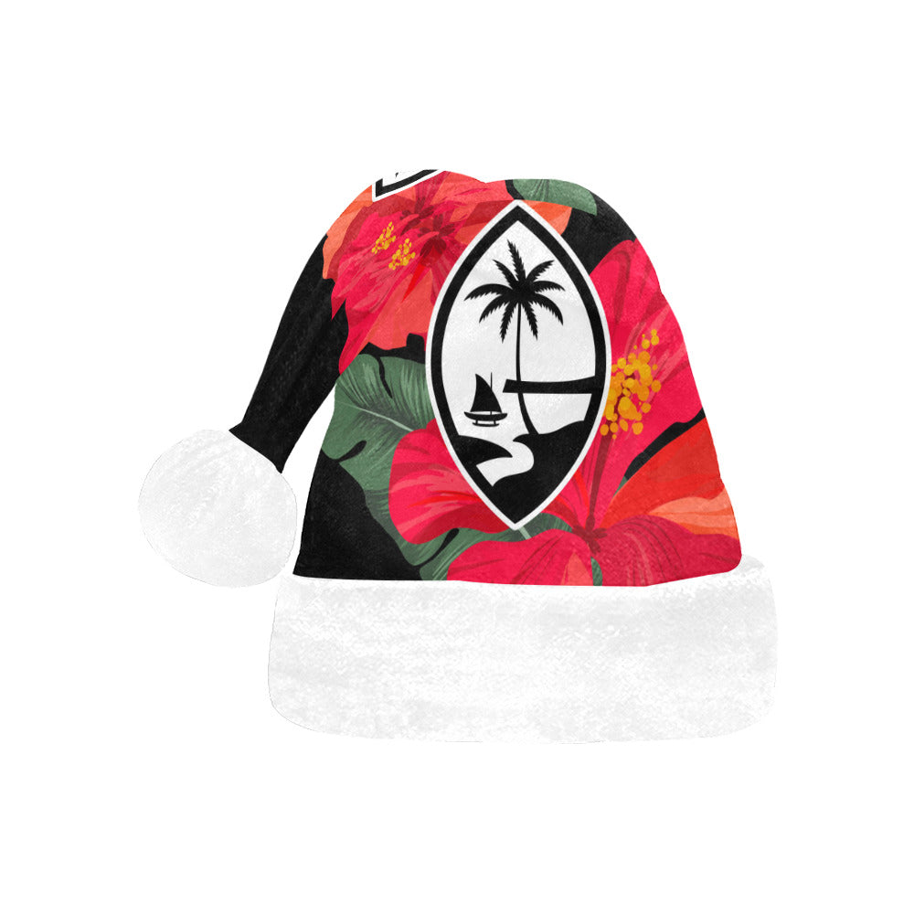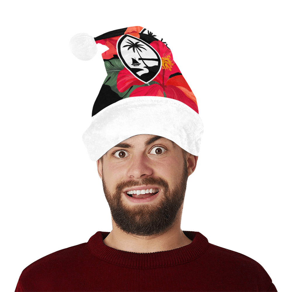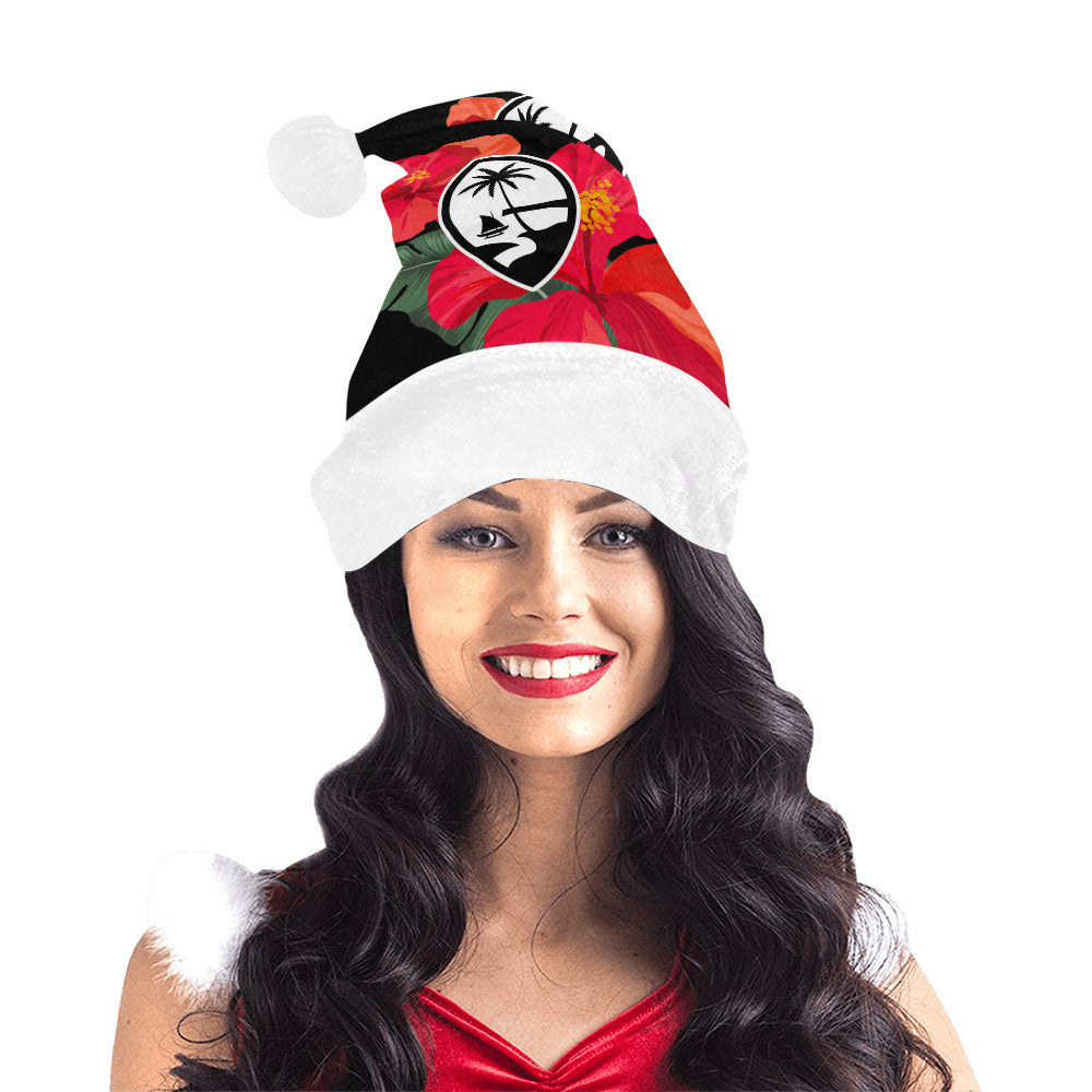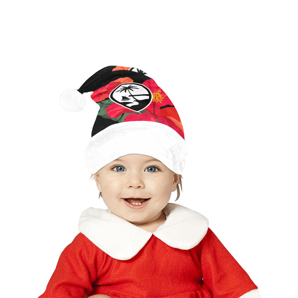 Celebrate a Chamorro Christmas with an original designed Guam Hibiscus Paradise Black Santa Hat! The design features the Guam seal with hibiscus flowers on a black background. Perfect for that work Christmas Party or just hanging with family. Felis Nabidat!