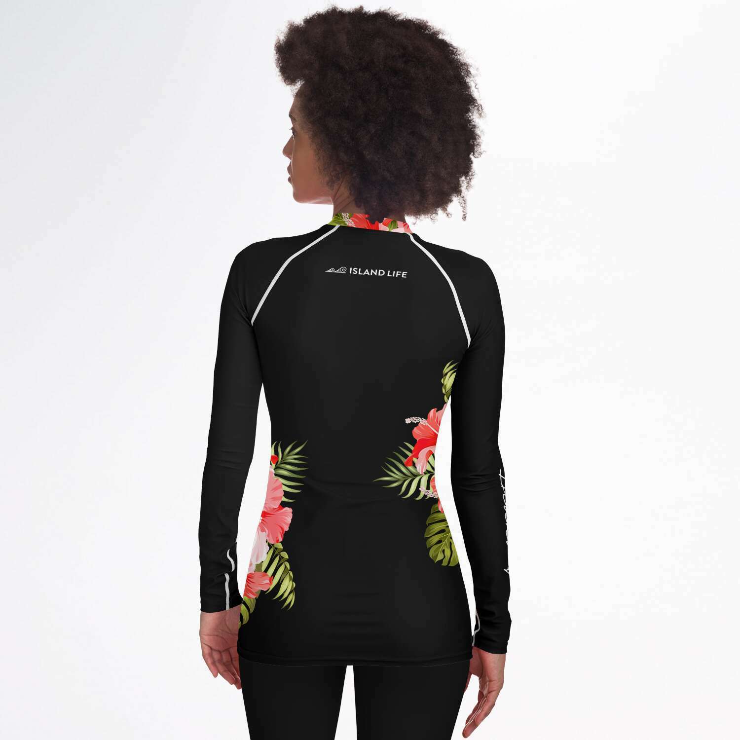 New! Guam Women's Rashguards feature hibiscus flowers, tropical leaves and the text, "Island Girl" on the right forearm.
