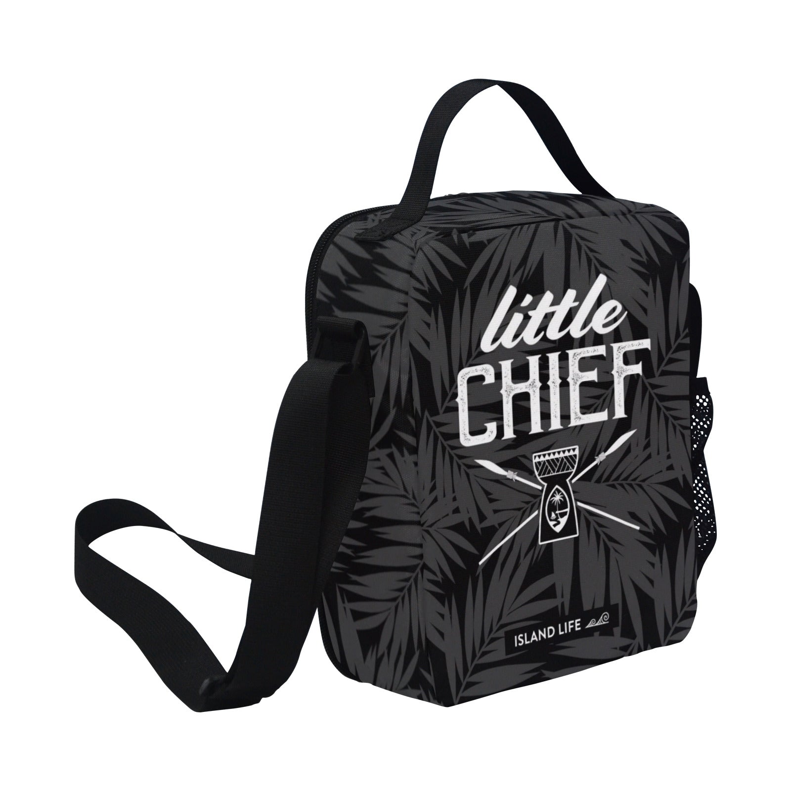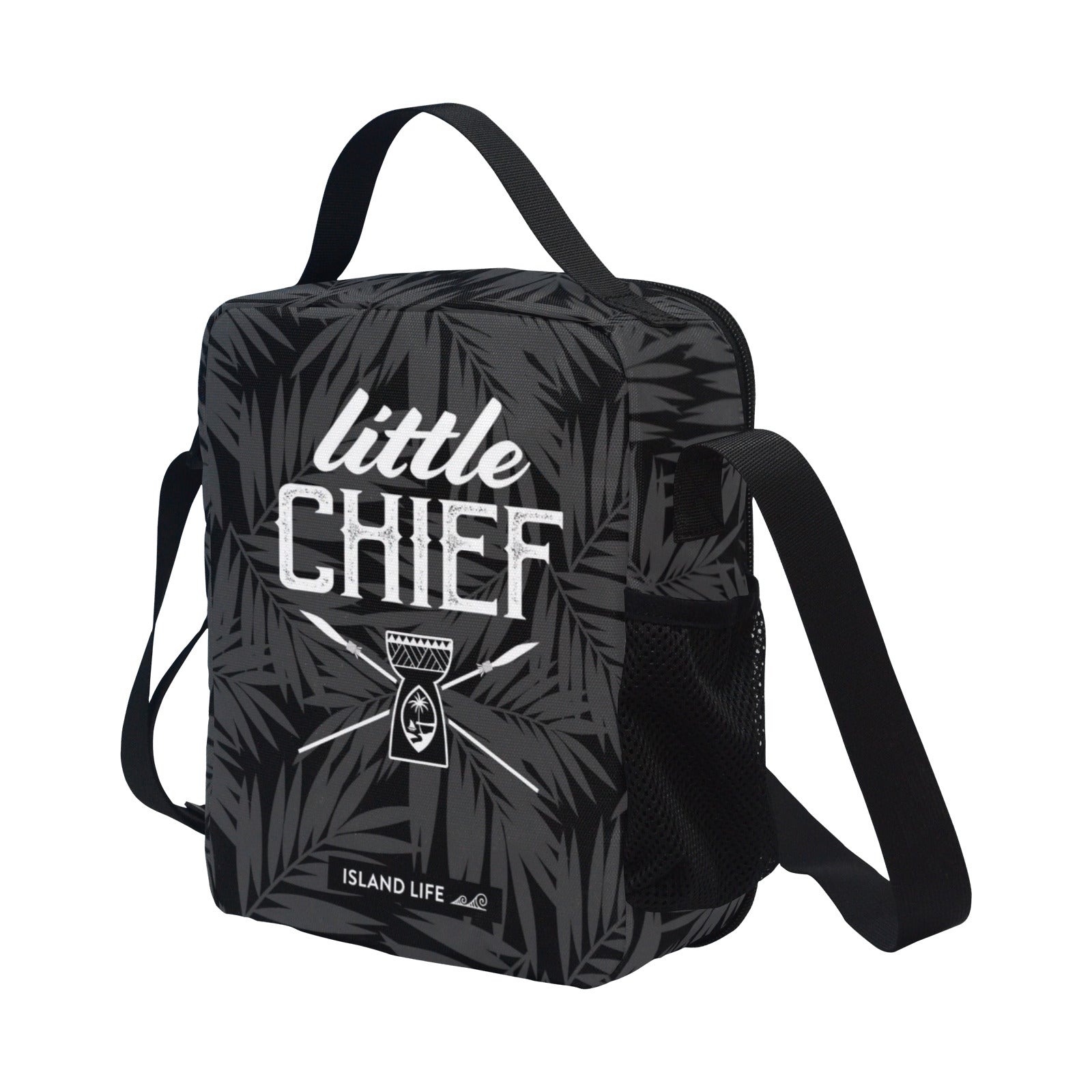 This design features the text, "little chief" above a latte stone and tribal spear with the Guam Seal on a coconut leaves background.