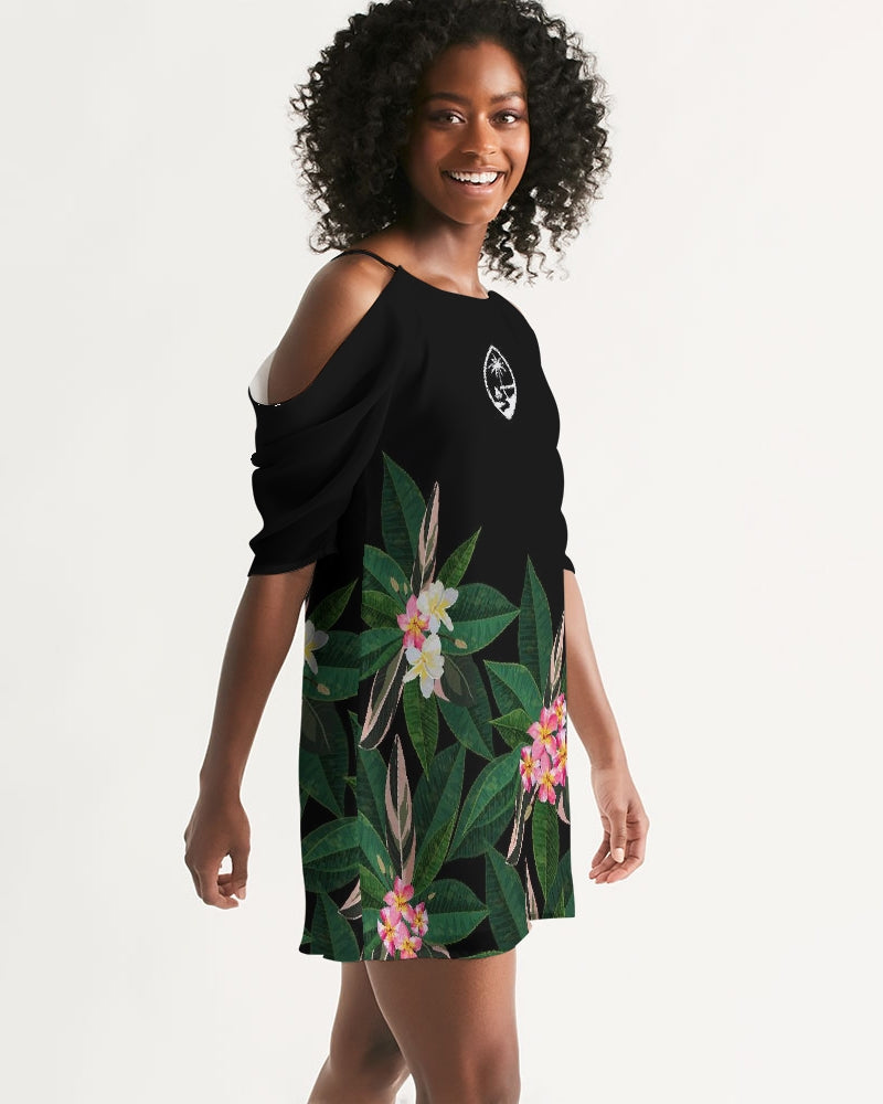 Guam Plumeria Flowers Black Women's Open Shoulder A-Line Dress