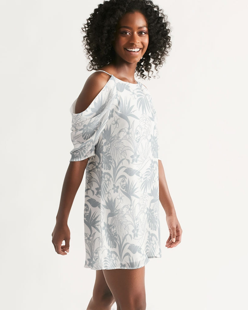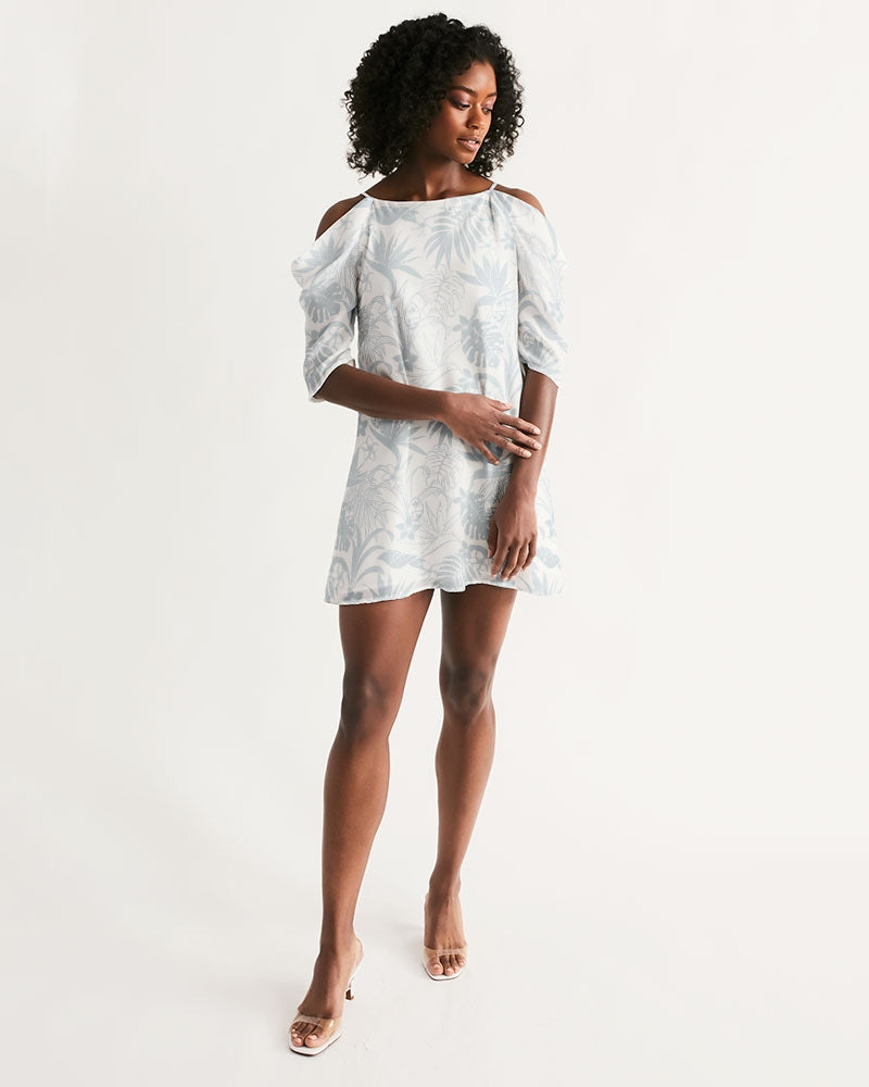 Flirty and fun, our Women's Open Shoulder Dress with a mini cut compliments every figure. Short, draped sleeves flow from the open shoulder neckline for an extra flirty flare.