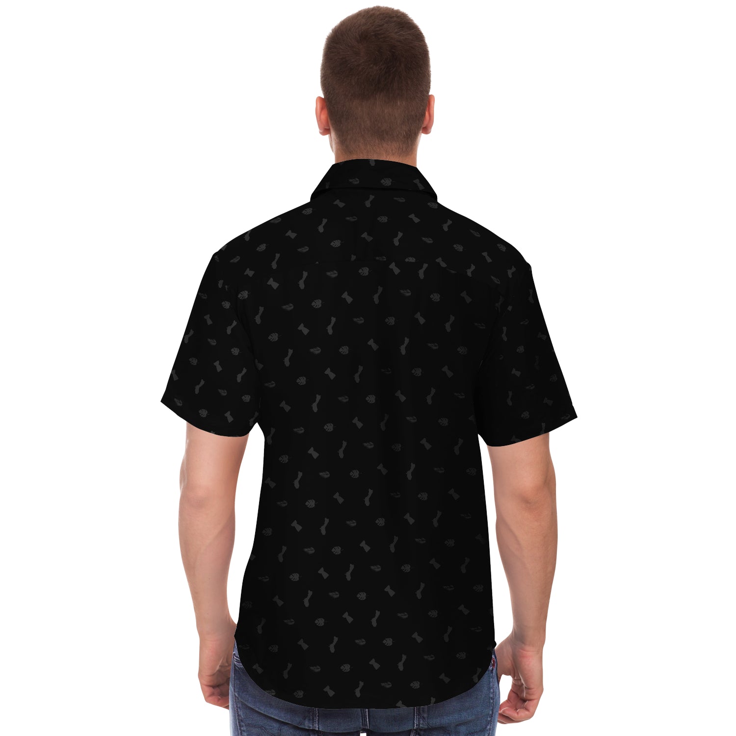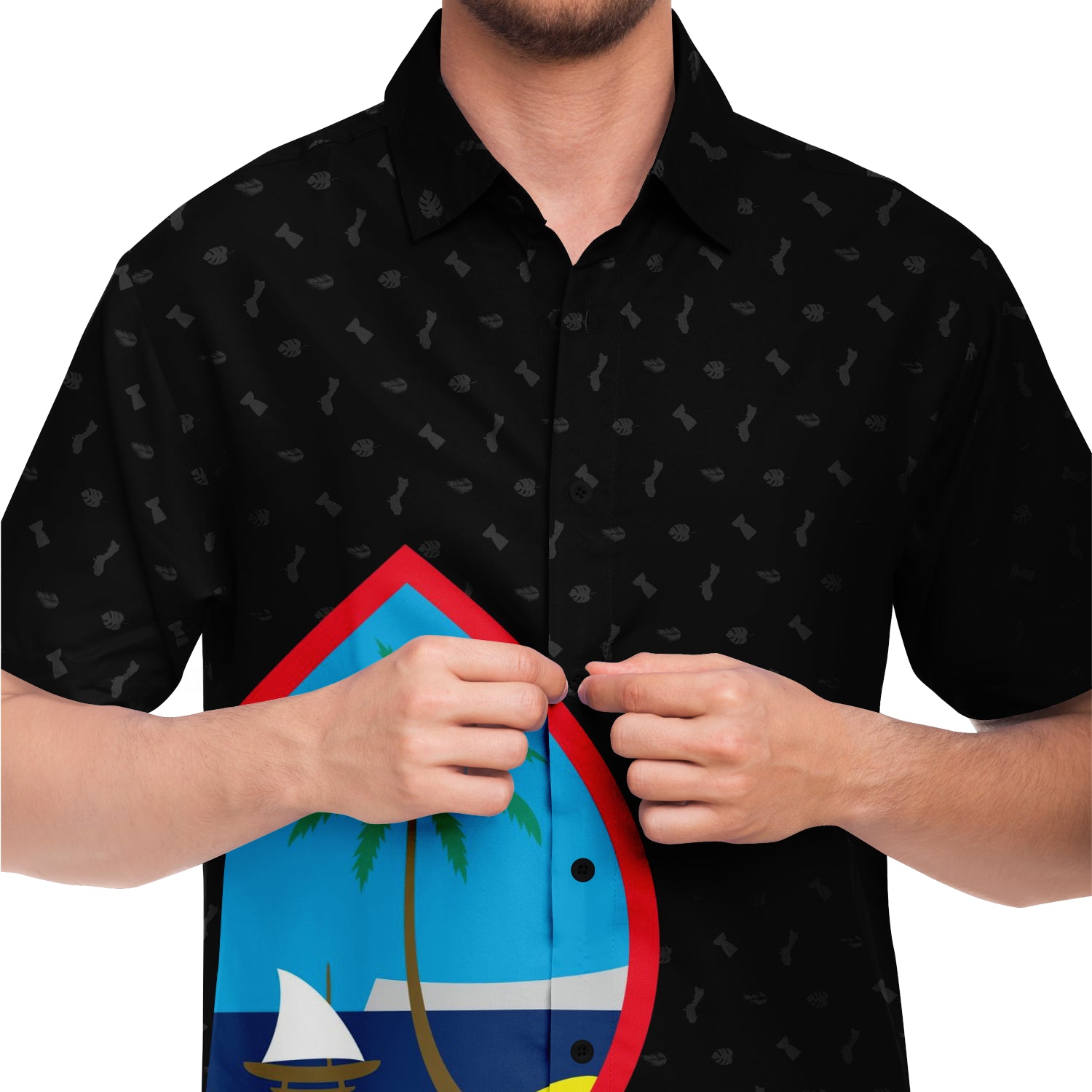 Represent your favorite island at weddings and other events with this Guam Seal Black Button Down All Over Print shirt featuring the Guam seal and a background featuring latte stones, the island of Guam, coconut leaves and breadfruit leaves. It comes in a regular width and spread collar. Perfect for those dressier hot days.