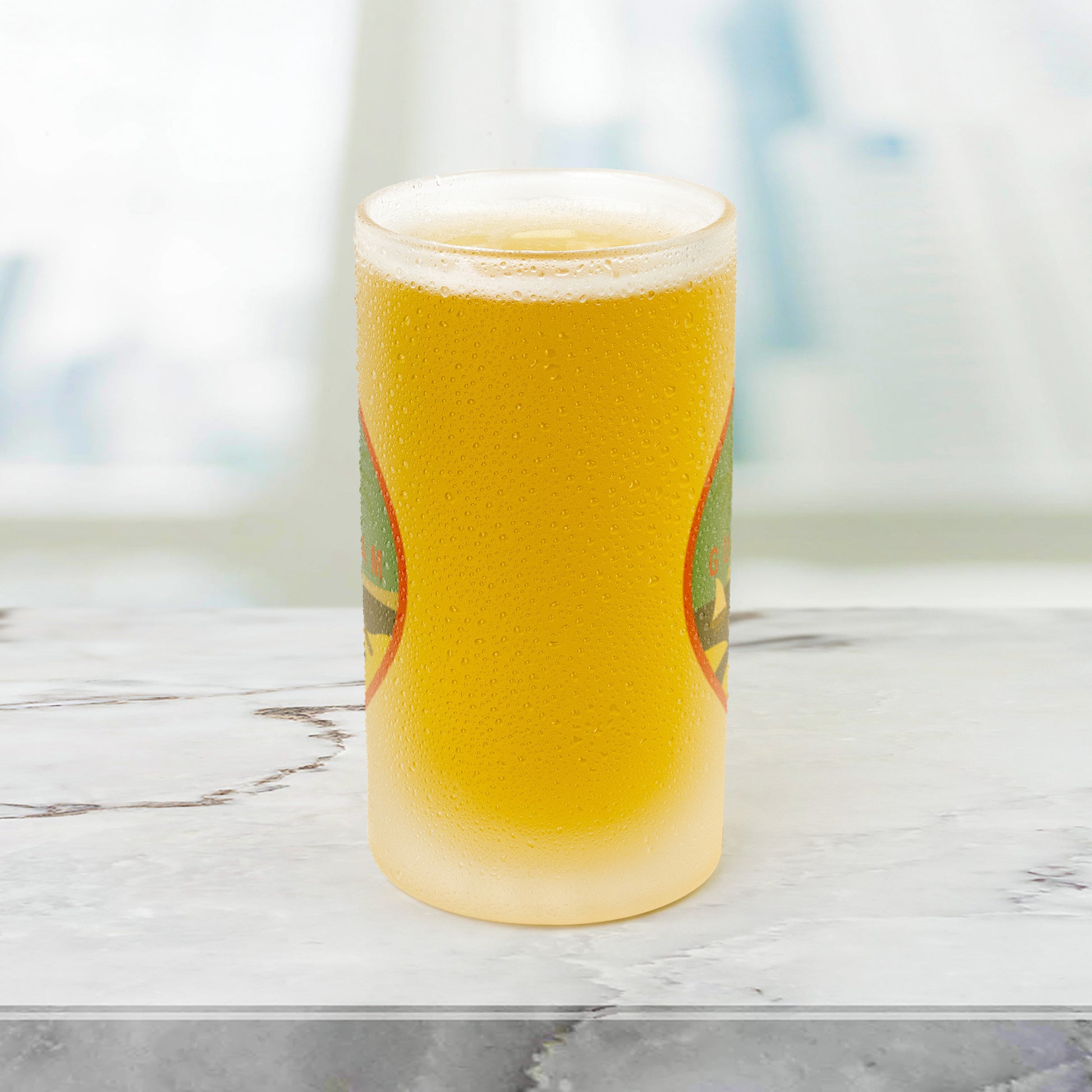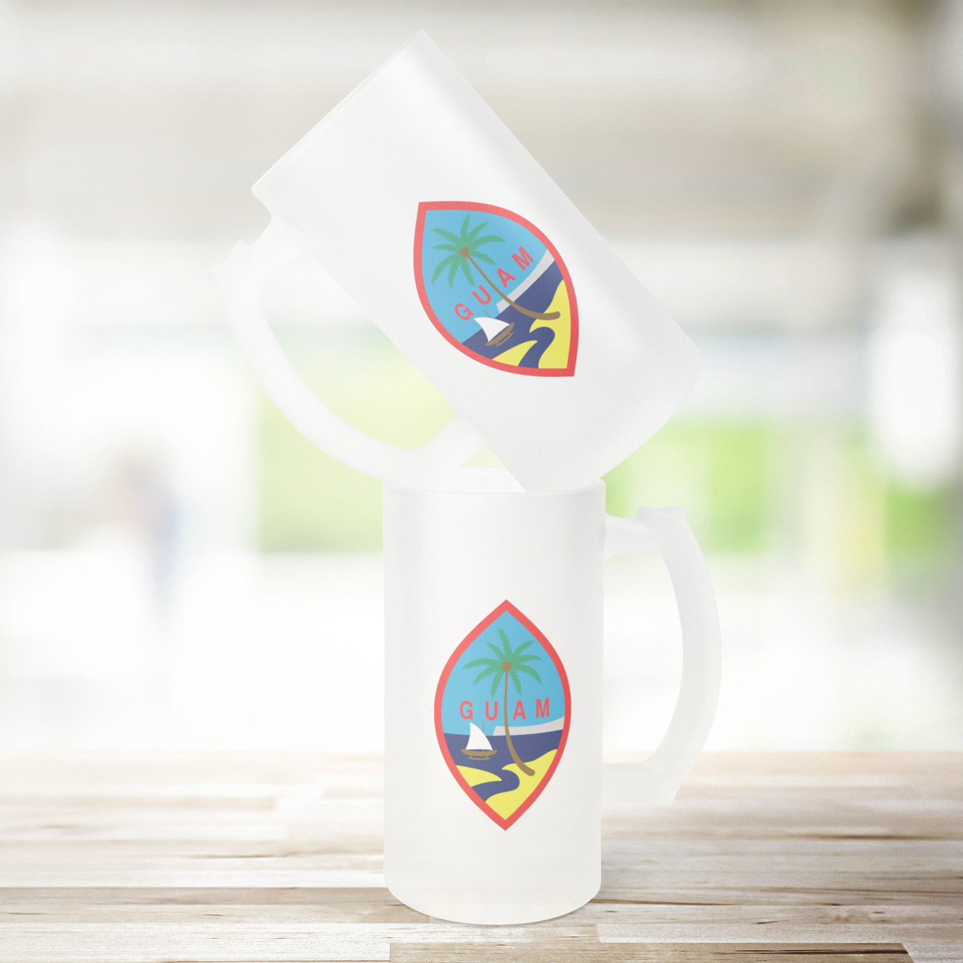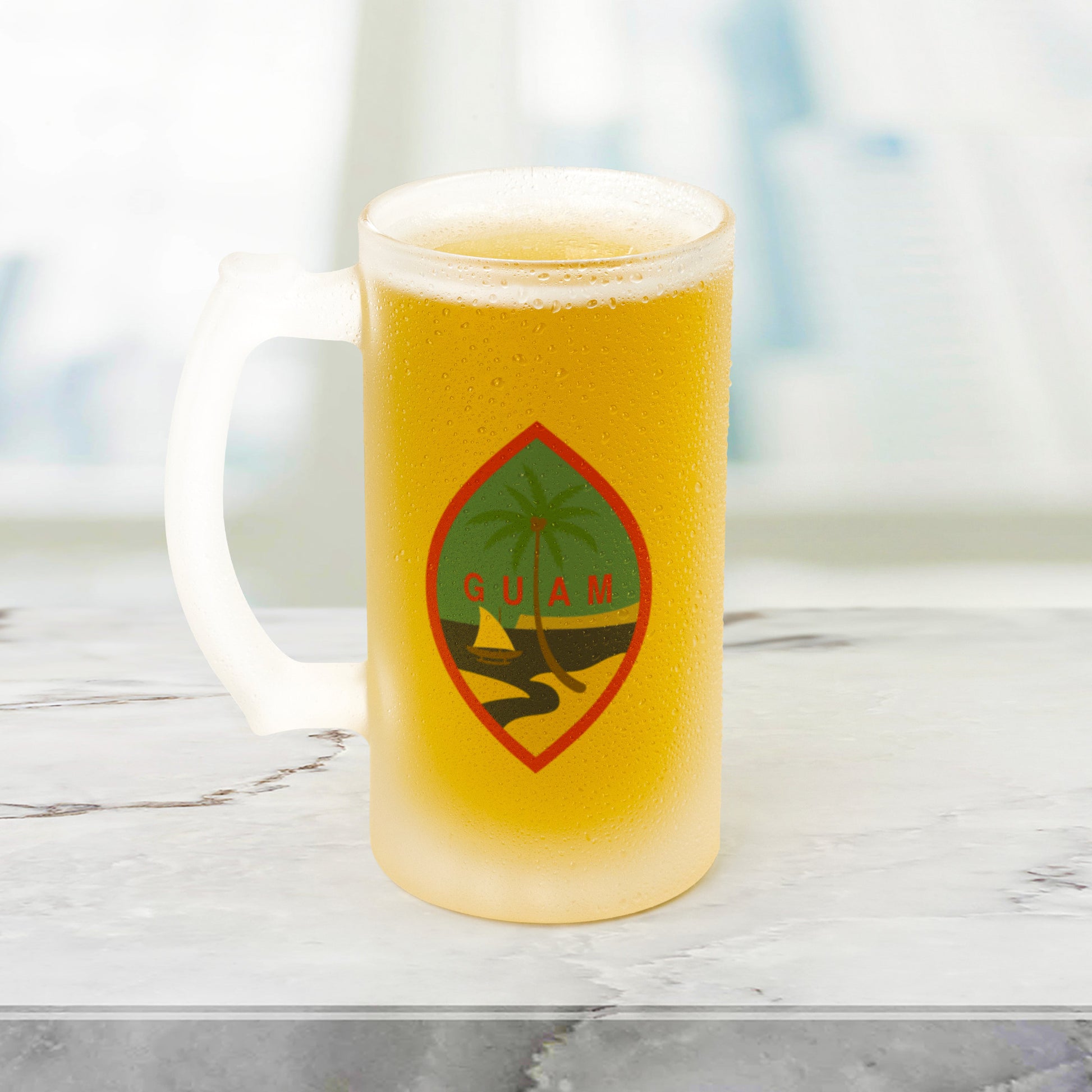Greetings beer-lovers! Prepare to cheers to our amazing Guam 16oz Frosted Beer Stein! Imagine this: the classic pint glass design that feels amazing in your grip, with a partially see-through finish that showcases the vibrant hue of your preferred brew.