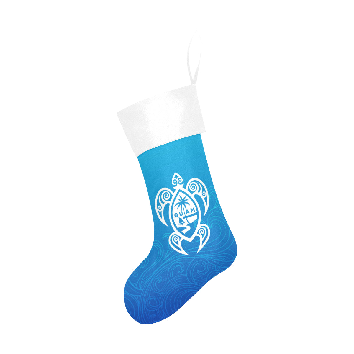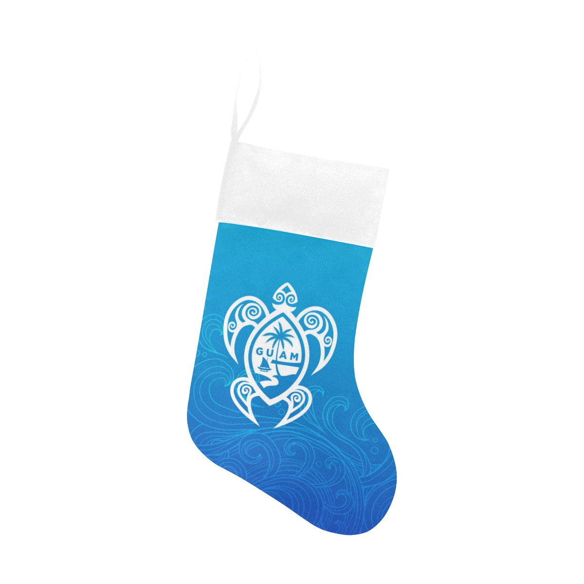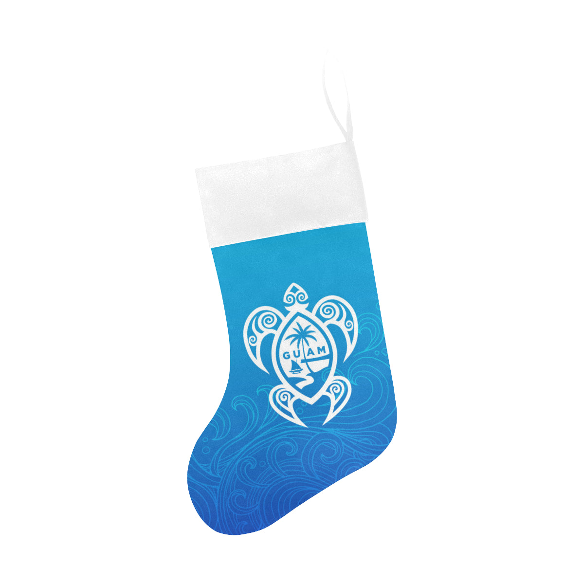 Guam Christmas Stocking featuring our original Tribal Turtle with the Guam seal on a solid blue background with hand drawn waves. The perfect way to keep your island home close during Christmas.