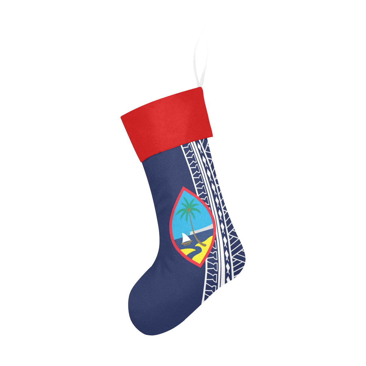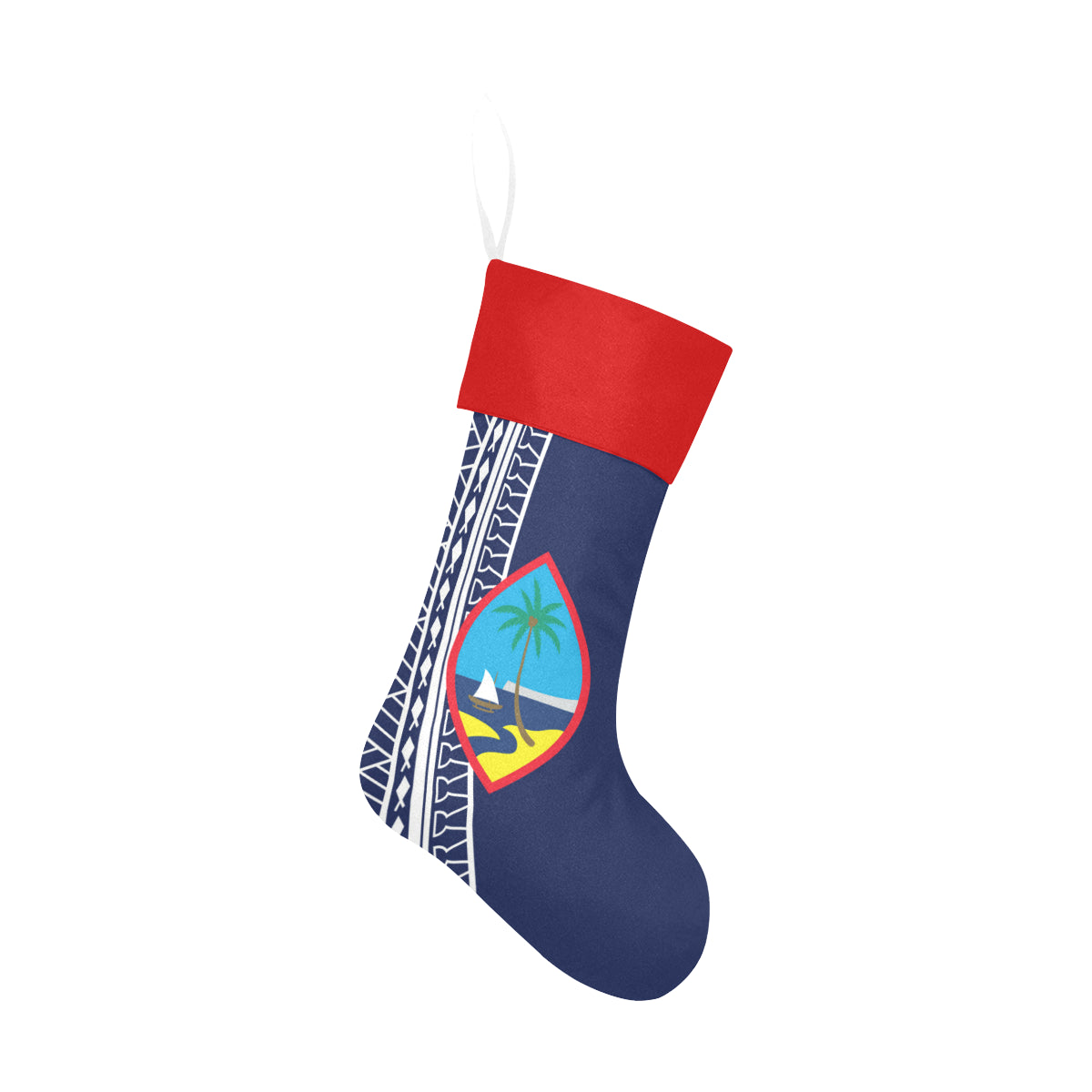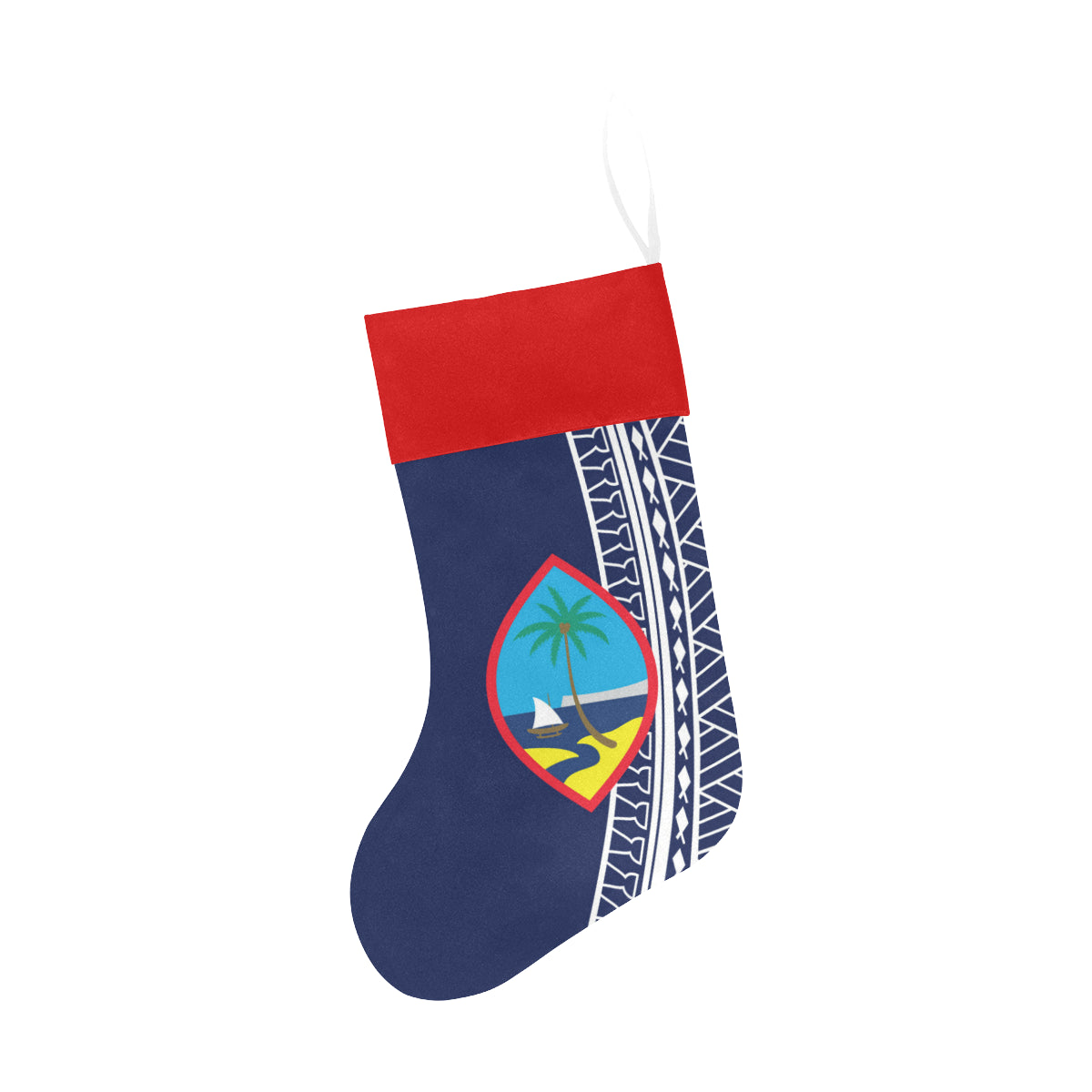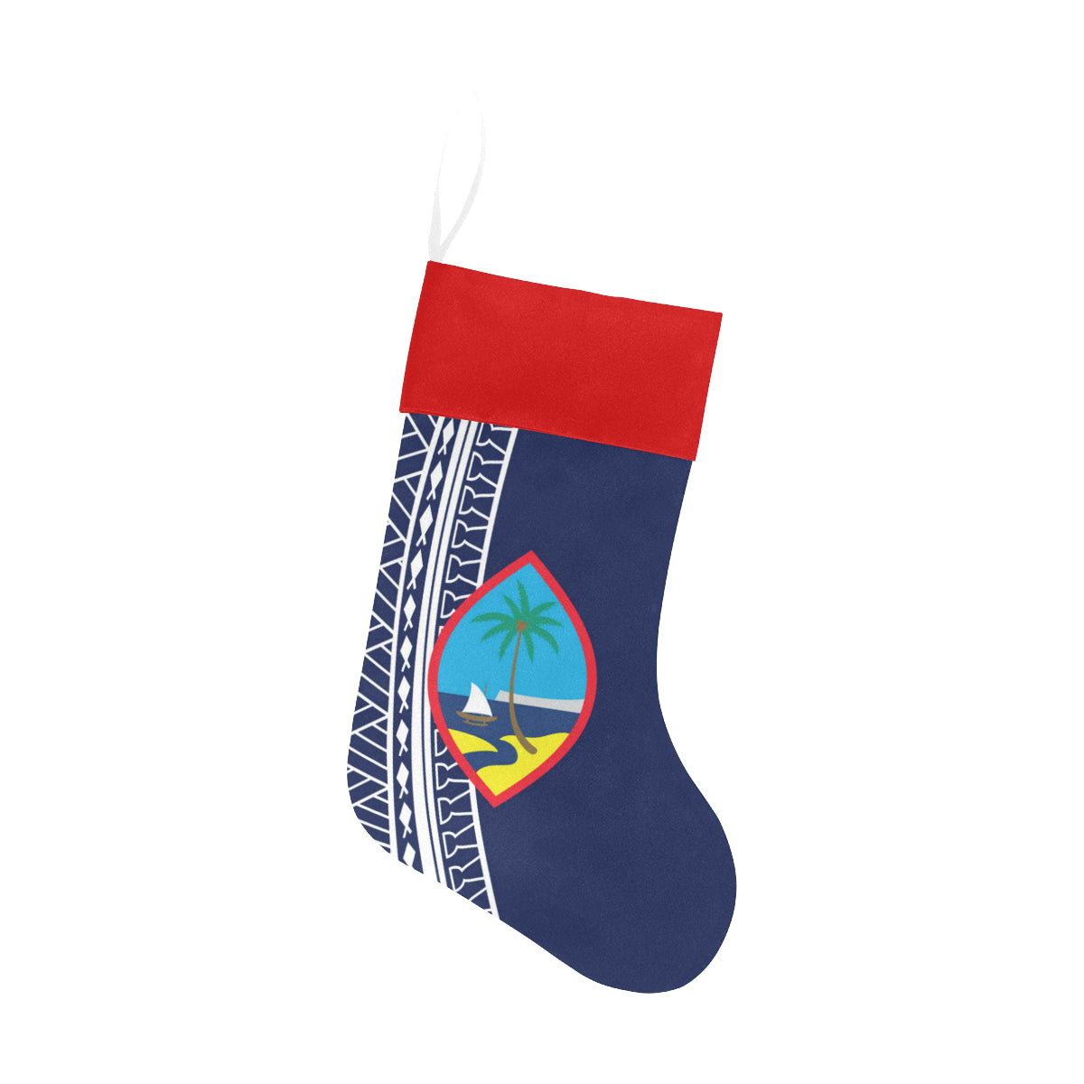 Guam Christmas Stocking with the Guam seal and a tribal design featuring latte stones, fish and basket weaving. The perfect way to keep your island home close during Christmas.