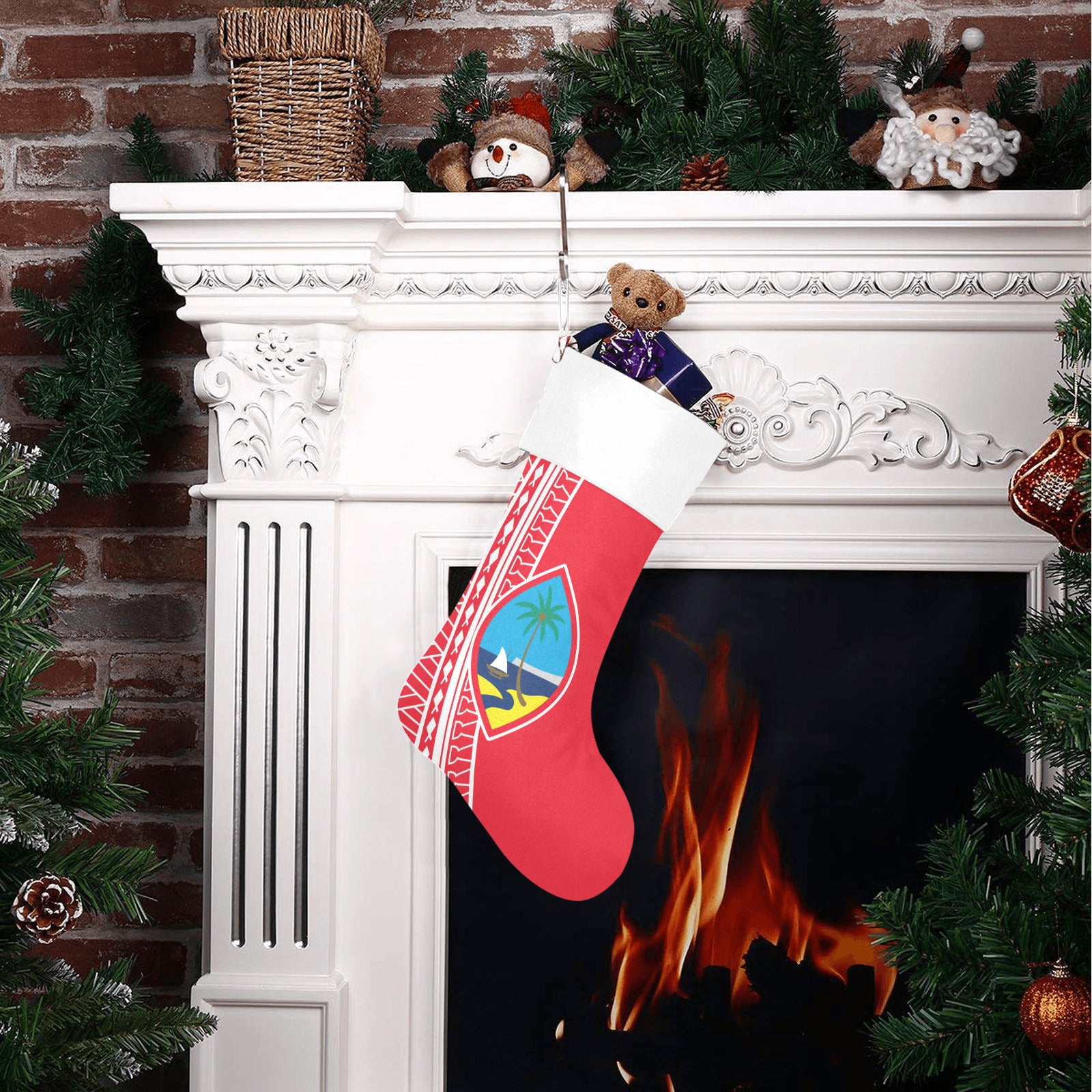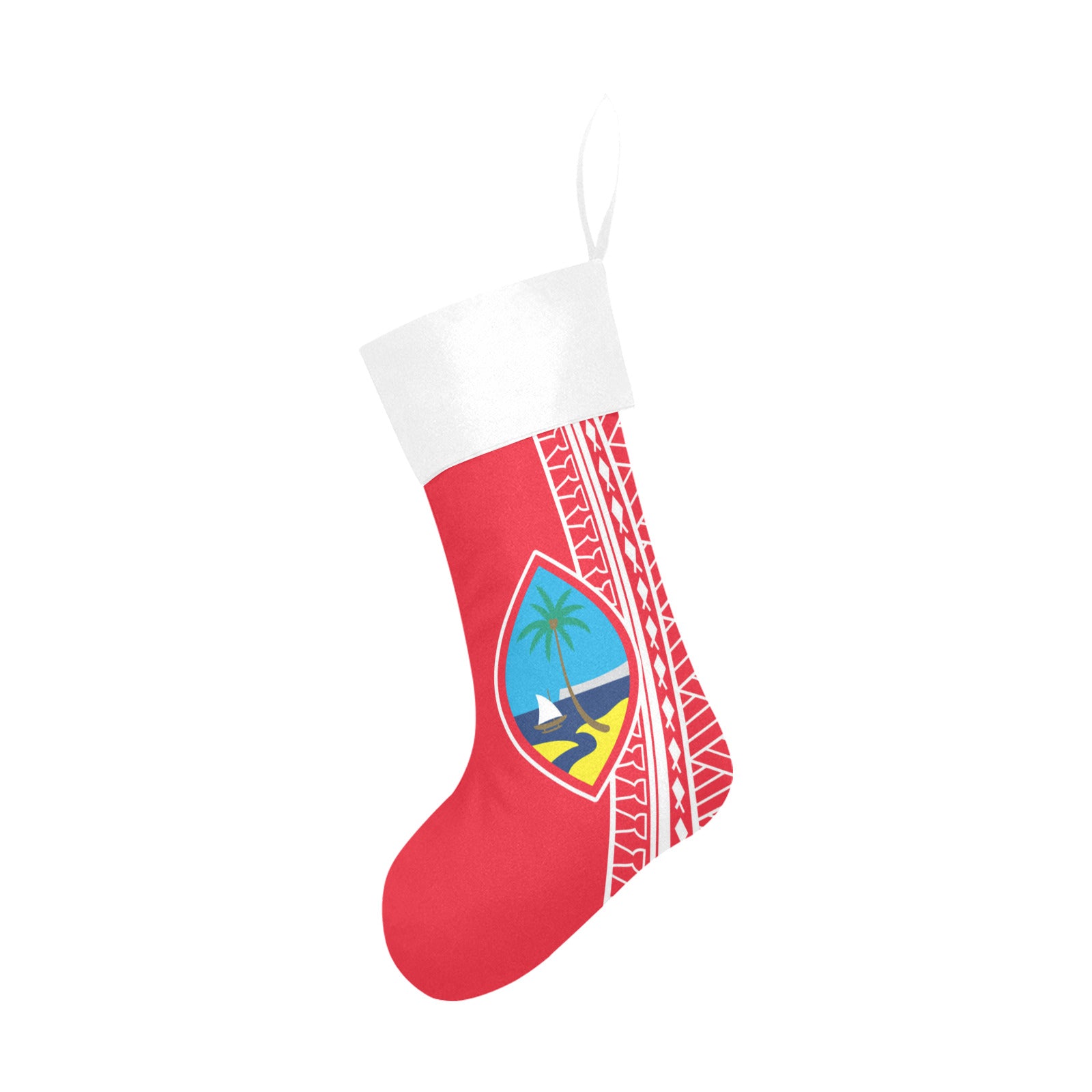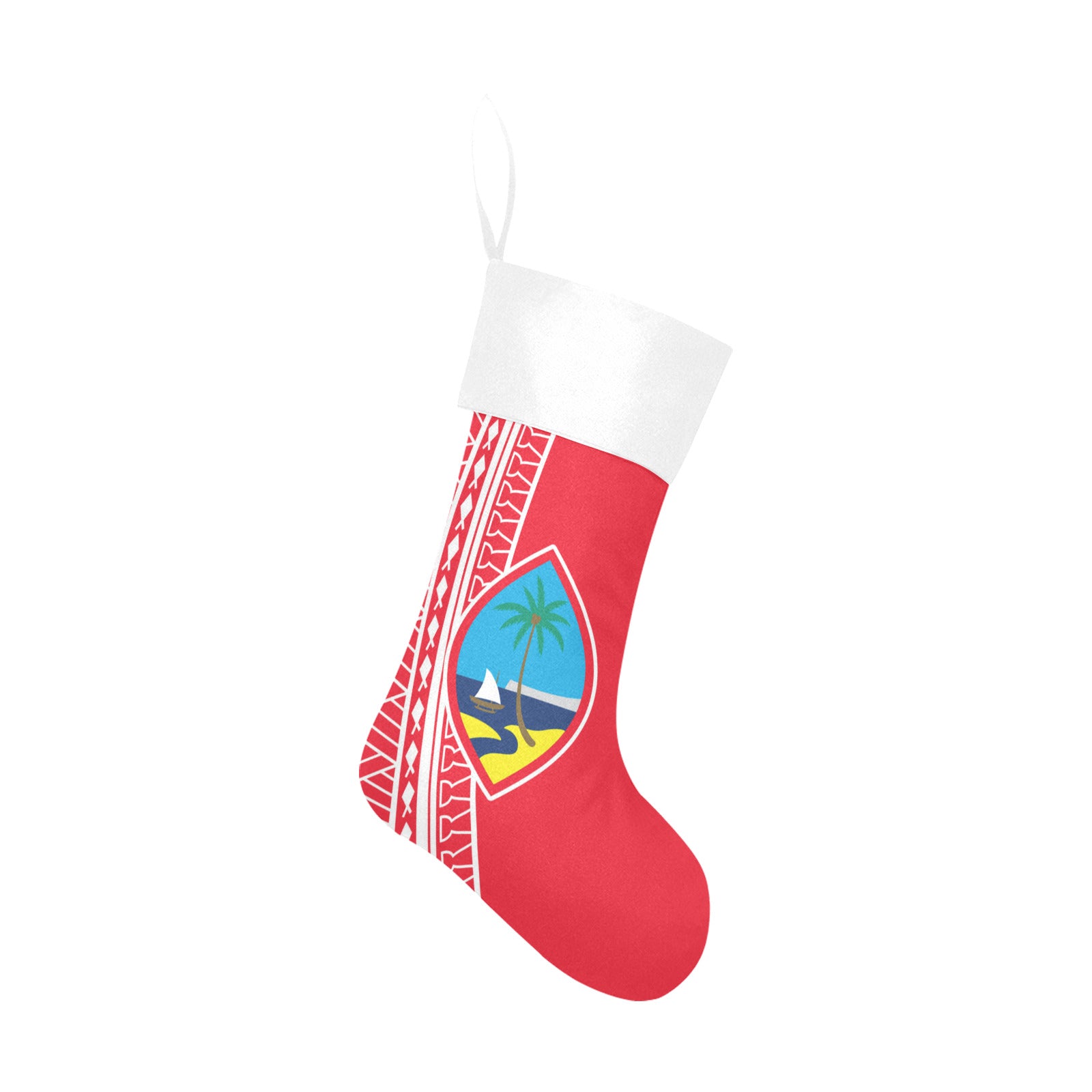 Guam Christmas Stocking with the Guam seal and a tribal design featuring latte stones, fish and basket weaving. The perfect way to keep your island home close during Christmas.