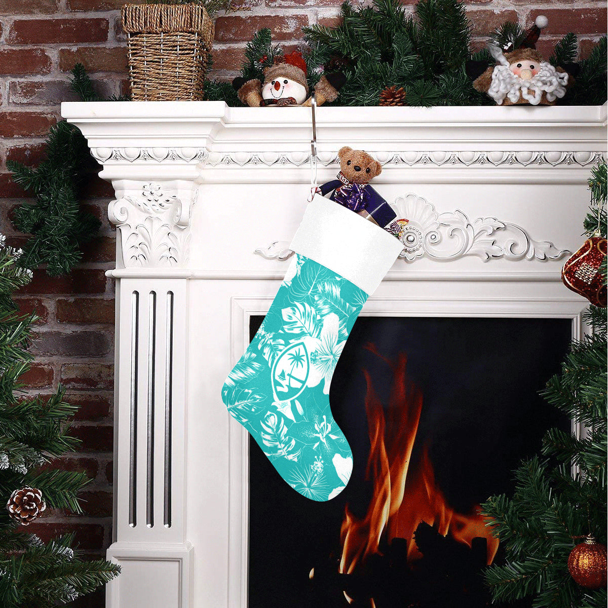 Guam Christmas Stocking with teal hibiscus flowers. The perfect way to keep your island home close during Christmas.