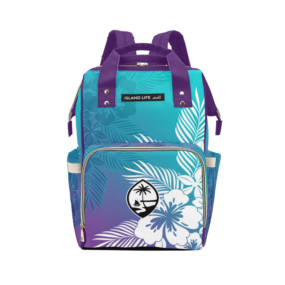 Introducing our newest product - Guam Baby Diaper Bags! This design features hibiscus flowers and tropical leaves on a teal and purple gradient background. This large, multi-function bag has several pockets and a large main compartment that can be used way past the baby and diaper stage. It's the perfect accessory for your little babies.