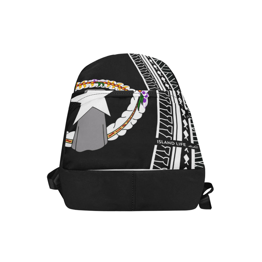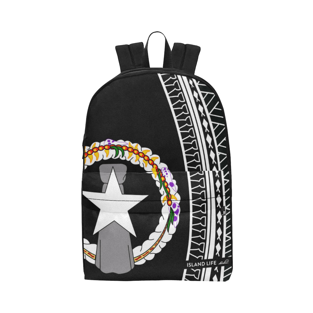 With a classic look that never goes out of style, durable construction, and details for all-day carrying comfort, this CNMI backpack is a must-have. This design features the CNMI seal with a custom modern tribal design made out of latte stones, fish and basket weaving. It also features the text, "Hafa Adai" across the top and tribal latte stones on the sides. All on a solid black background.