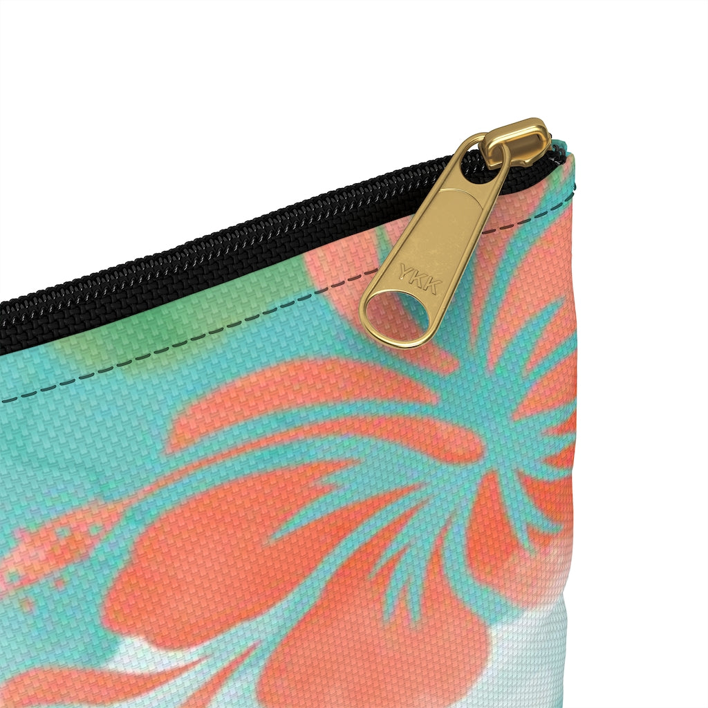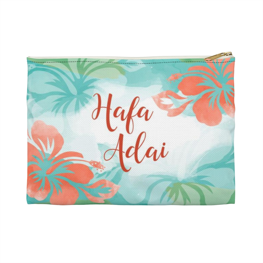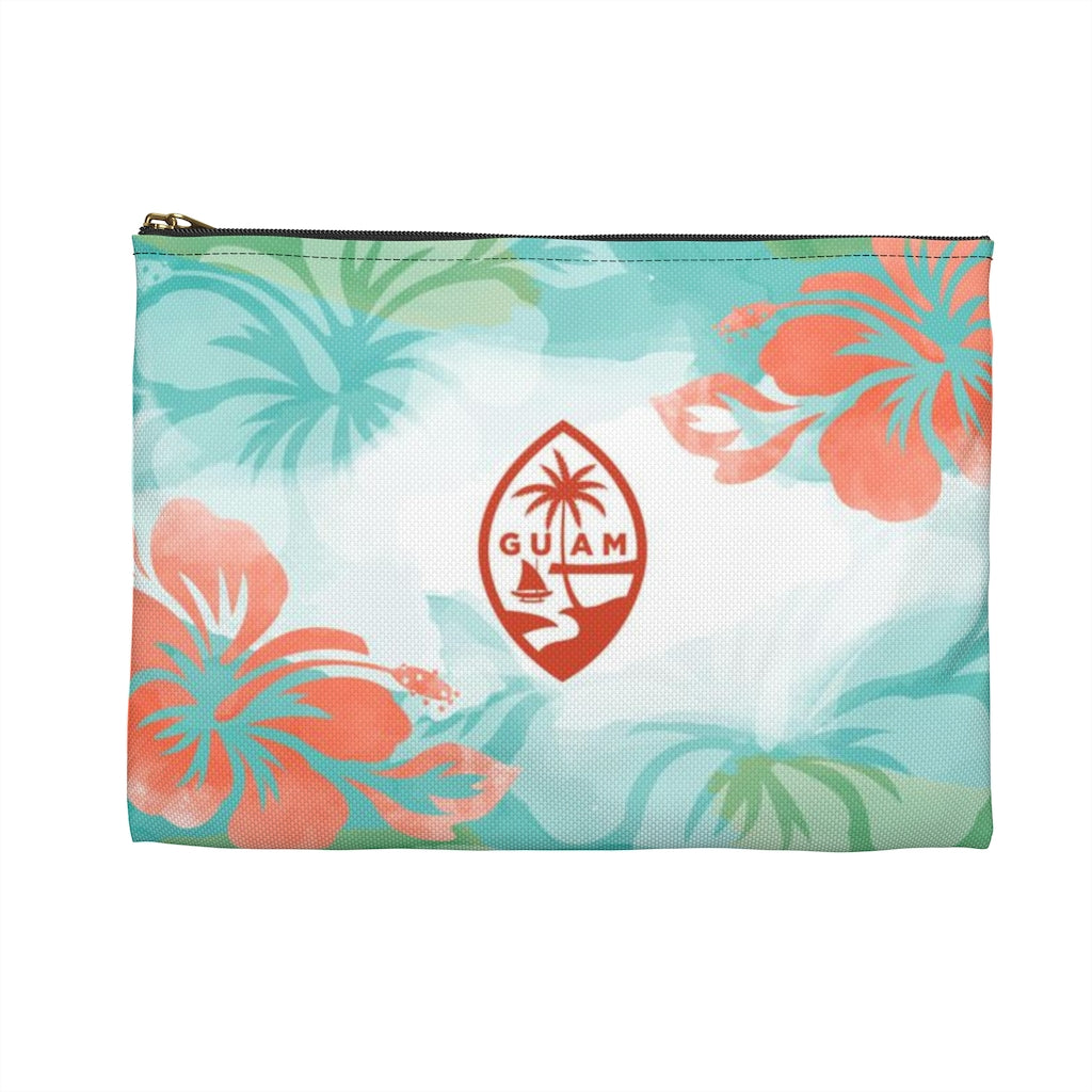 This high quality accessory pouch in two sizes and two different zipper colors. Featuring the words "Hafa Adai" on one side and the Guam Seal on the other side on a blue, green, and white background with hibiscus flowers.