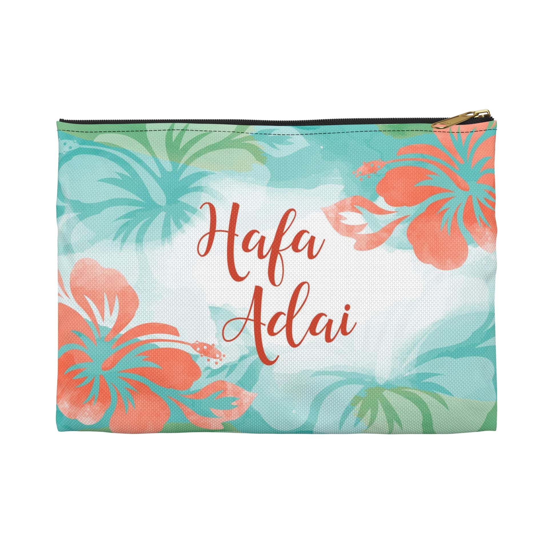 This high quality accessory pouch in two sizes and two different zipper colors. Featuring the words "Hafa Adai" on one side and the Guam Seal on the other side on a blue, green, and white background with hibiscus flowers.