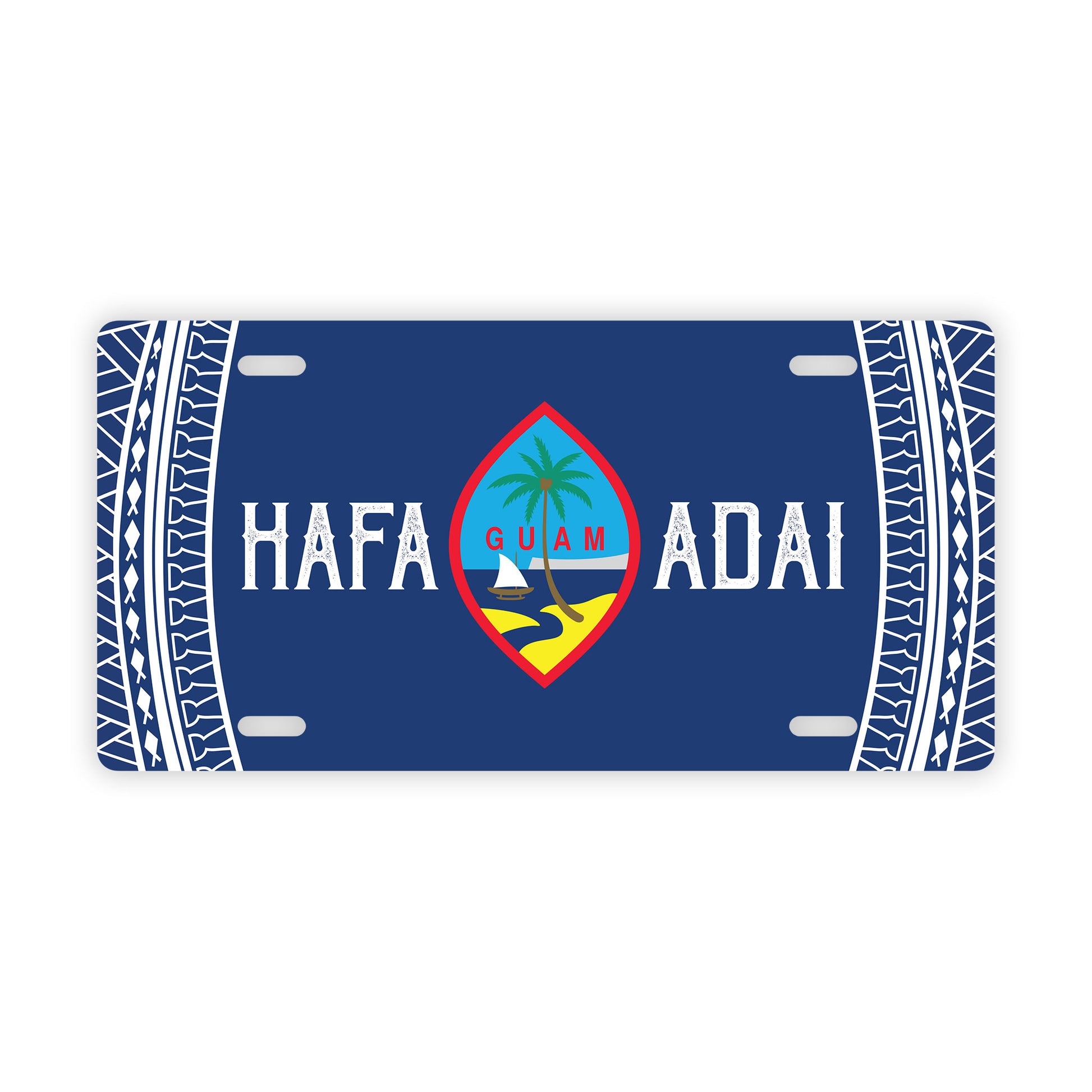 Represent your island where you are with these high quality, aluminum Guam License Plates. These license plates feature the Guam seal, the text "Hafa Adai" and a tribal print featuring latte stones, fish, and a basket weave.