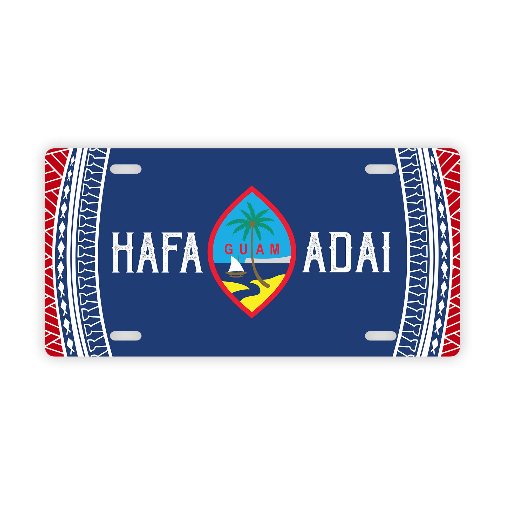 Represent your island where you are with these high quality, aluminum Guam License Plates. These license plates feature the Guam seal, the text "Hafa Adai" and a tribal print featuring latte stones, fish, and a basket weave.