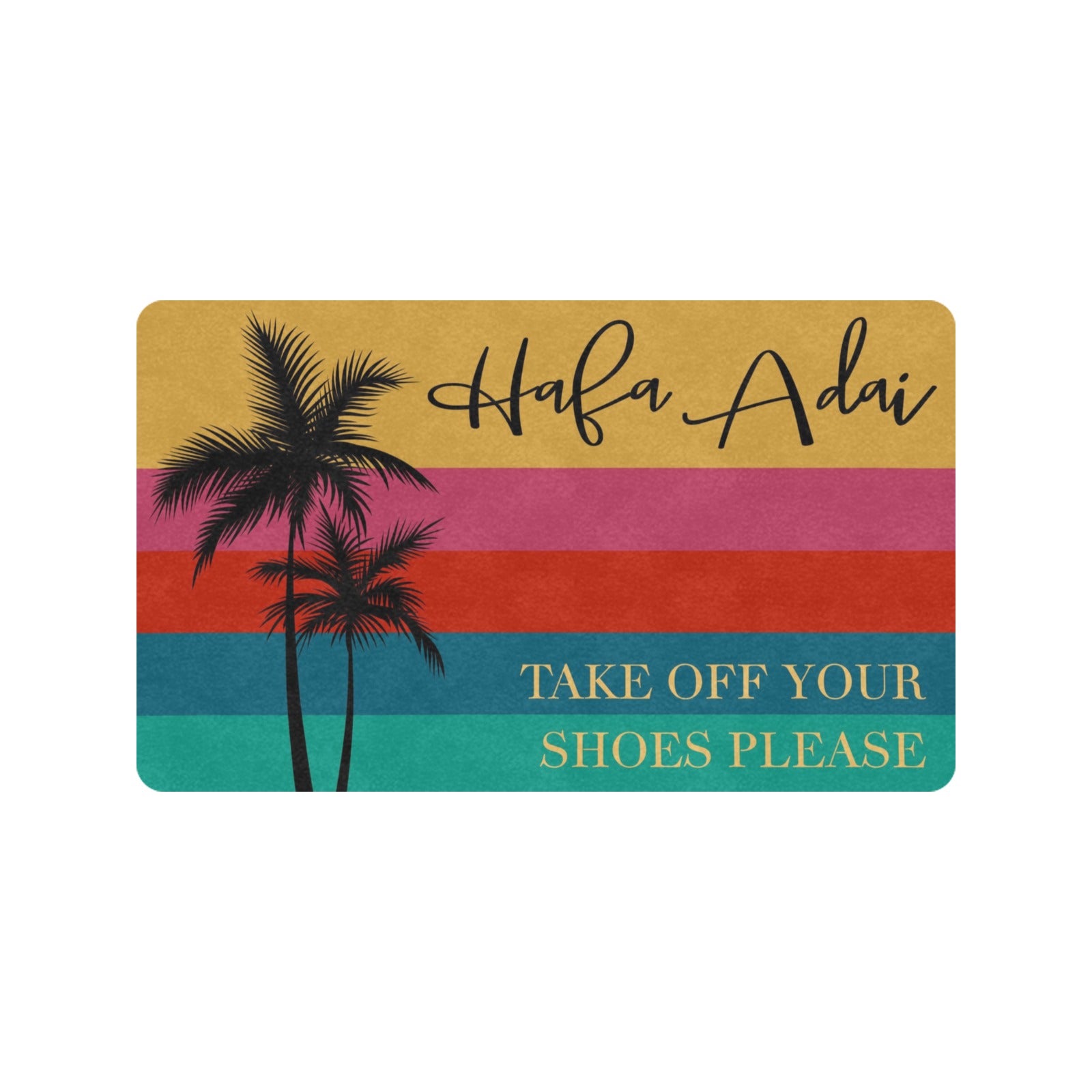 This design features a retro rainbow design and the text, "Hafa Adai" at the top and "Take off your shoes please" at the bottom with coconut trees.