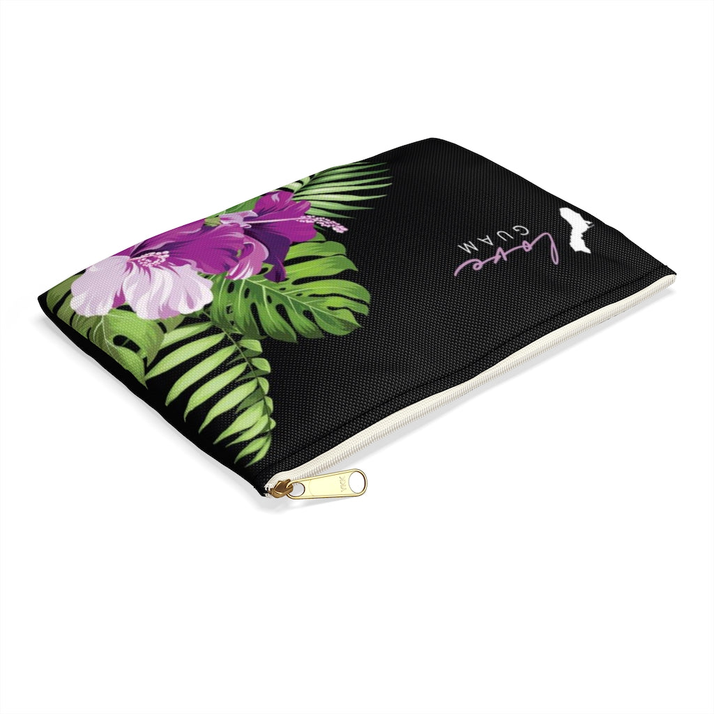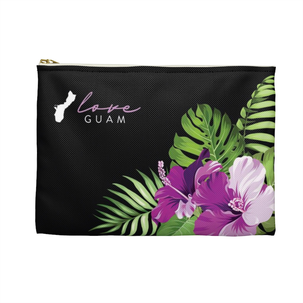 This high quality accessory pouch in two sizes and two different zipper colors. The design is a beautiful hibiscus art with text, "Love Guam" and island of Guam shape on a black solid background.