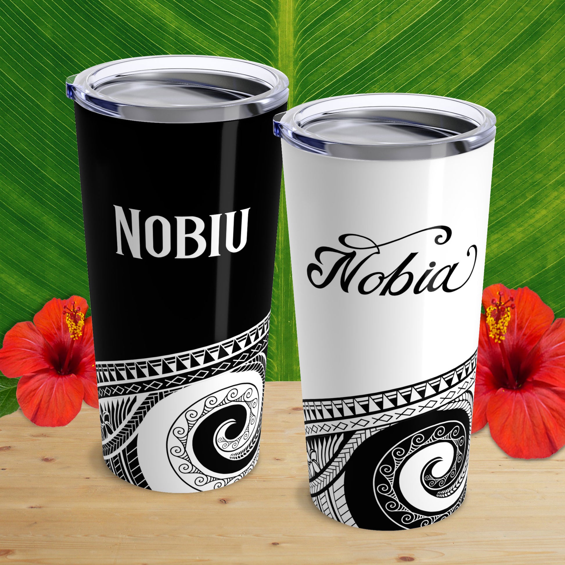 The perfect wedding gift set for a Chamorro couple! "Nobiu" means Groom in Chamorro and "Nobia" means Bride in Chamorro. The tribal art was inspired by the island of Guam with waves, fish, flowers, and coconut leaf weaving. This listing is for both the black and white tumblers.