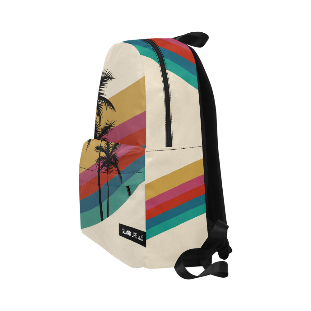 With a classic look that never goes out of style, durable construction, and details for all-day carrying comfort, this Guam backpack is a must-have. This design features coconut trees over a retro rainbow sunset.